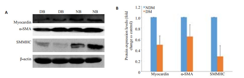 造模9周时,DM组膀胱中的myocardin蛋白的表达(0.131±0.022)比NDM组(0.292±0.10)明显下降,P=0.013。DM组膀胱中的α-SMA(0.637±0.150)比NDM组(1.030±0.152)明显下降,P=0.003。DM组膀胱中的SMMHC蛋白(0.315±0.134)比NDM组(1.844±1.03)明显下降(P=0.019,图 3)。