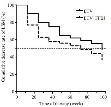 图4 恩替卡韦组联合复方鳖甲软肝片组与单用恩替卡韦组LSM稳定地下降一个等级所需中位时间曲线 Fig.4 Median time of stable LSM declination by one level in combination therapy (ETV + FFBJ) and ETV groups. |