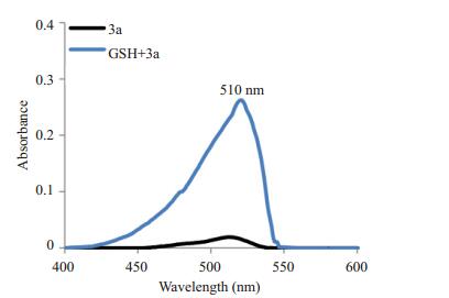 图 1 GSH(5mmol/L)处理前后3a(15μmol/L)的吸收光谱 Figure 1 Absorption spectra of 3a (15 μmol/L) detected in the presence or absence of GSH (5 mmol/L). |