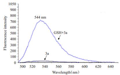 图 2 GSH (5 mmol/L)处理前后3a (5 μmol/L)的荧光光谱 Figure 2 Fluorescence spectra of 3a (5 μmol/L) detected in the presence or absence of GSH (5 mmol/L). |