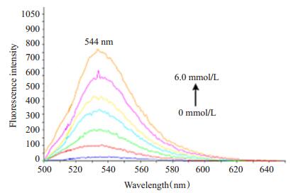 图 3 GSH (0~6 mmol/L)处理后3a (5 μmol/L)荧光光谱的变化 Figure 3 Fluorescence changes of 3a (5 μmol/L) after treatment with increasing concentrations of GSH (0-60 mmol/L). |