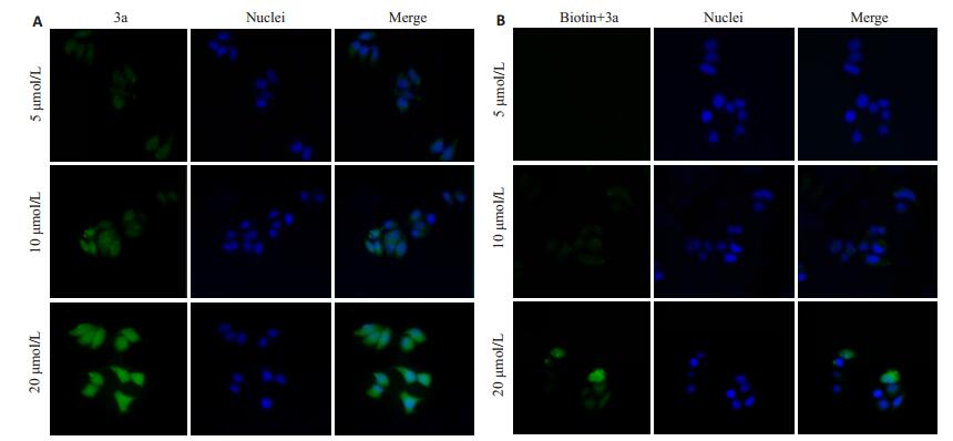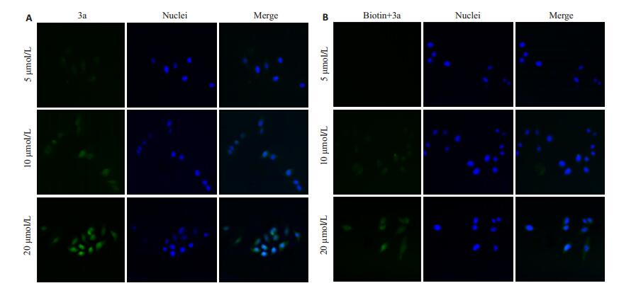 1.2.3 3a的活细胞荧光成像将MCF-7细胞、MDAMB-231细胞和Hs 578Bst细胞分别接种于48孔板, 细胞贴壁后, 每孔加入20 μg/mL DAPI染色20 min, PBS洗3次, 实验组加入10 μmol/L 3a处理2 h。对照组用100 μmol/L的生物素预处理2 h后, PBS洗3次, 以10 μmol/L 3a处理2 h。各组细胞用PBS洗3次, 4 ℃下4%多聚甲醛固定20 min, PBS洗2次, 每次3 min, 弃PBS, 荧光倒置显微镜下观察拍照。