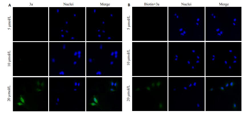 图 6 不同浓度3a对Hs 578Bst细胞的荧光成像效果 Figure 6 Fluorescence images of Hs 578Bst cells treated with different concentrations of 3a (×400). A: Cells without biotin pretreatment; B: Cells pretreated with biotin. |