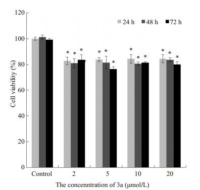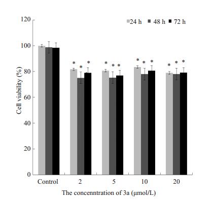 图 9 0~20 μmol/L 3a孵育不同时间对Hs 578Bst细胞存活率的影响 Figure 9 Effect of 0-20 μmol/L 3a on Hs 578Bst cell viability over time (Mean±SD, n=3). *P < 0.05 vs control group. |