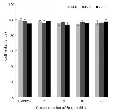 1.2.4 MTT法评价3a对MCF-7细胞、MDA-MB-231细胞和Hs 578Bst细胞的毒性将MCF-7细胞、MDAMB-231细胞和Hs 578Bst细胞分别接种于96孔板, 细胞贴壁后, 加入终浓度为0、2、5、10、20 μmol/L的3a, 对照组加入新鲜培养基, 每组设5个复孔, 分别作用24、48、72 h后吸去培养基, 每孔加入20 μL MTT溶液(5 mg/mL), 避光孵育4 h, 吸去孔内液体, 每孔加入150 μL DMSO, 震荡10 min, 充分溶解结晶, 酶标仪于570 nm处测吸光值。细胞存活率=实验组吸光度值/对照组吸光度值×100%。
