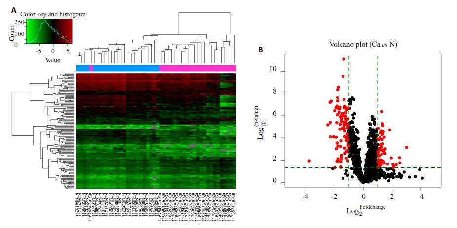 图 2 宣威地区肺腺癌差异microRNAs层次聚类分析 Figure 2 Heat map and hierarchical clustering (A) and volcano plot (B) of differential miRNA profiles in lung adenocarcinoma in Xuanwei area. A: The relative expression values are depicted according to the color scale. Red indicates up-regulation; green indicates down-regulation; B: Red dot represents a statistically significant difference in the expression of microRNAs (P<0.05). |