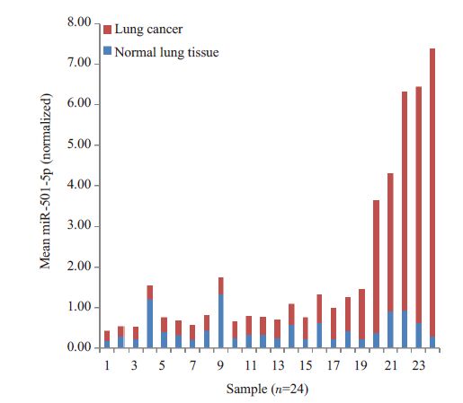 图 3 miR-501-5p 在癌组织和相应肺组织样本的表达量比较 Figure 3 Comparison of miR-501-5p expression between tumor and adjacent tissues. Data presented are fold changes vs normal tissue (mean 3.168 848; P=0.022 376, FDR: 0.071 395). |