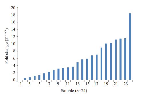 图 4 宣威肺癌中miR-501-5p表达倍数 Figure 4 Expression level of miR-501-5p in lung cancer tissues relative to normal tissue in Xuanwei area. The mean fold change was 5.702±4.626. |
