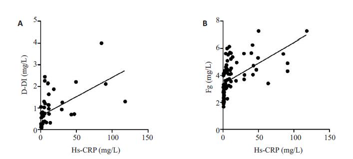 图 1 Hs-CRP分别与D-DI、Fg的相关性分析 Figure 1 Correlation analysis of serum Hs-CRP level with D-DI and Fg. A: Hs-CRP was positively correlated with D-DI (r=0.539, P < 0.01); B: Hs-CRP was positively correlated with Fg (r=0.534, P < 0.01). |