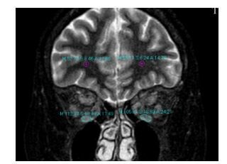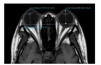 图 2 在T1WI序列测量眼球突出度 Figure 2 Degree of exophthalmus measured in T1WI sequence. |