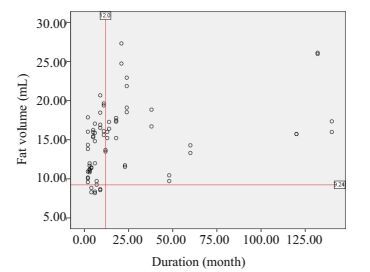 图 3 病程与脂肪体积相关性散点图 Figure 3 Scatter plot showing the correlation between disease course (cutoff point of 1 year)and orbital fat volume. |