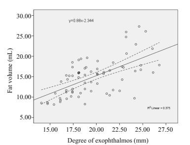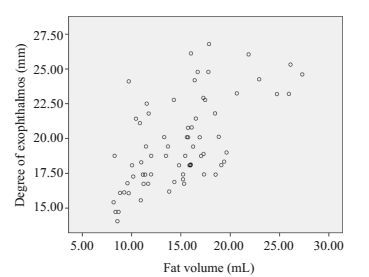 图 4 突眼度与脂肪体积相关性散点图 Figure 4 Scatter plot showing the correlation between orbital fat volumes and the degree of exophthalmos. |