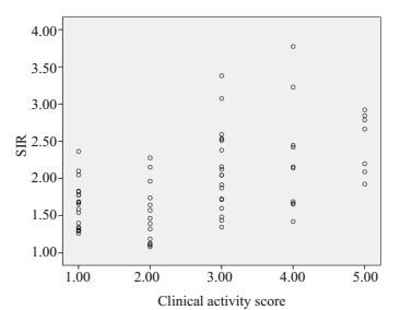 图 5 SIR值与CAS相关性散点图 Figure 5 Scatter plot showing the correlation between the CAS and the SIR(r=0.536, P < 0.01) |
