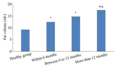 以病程作为分组条件将患者分为3组,6个月以内组患者球后脂肪体积为12.49±2.90 mL;6~12个月组球后脂肪体积14.76±4.28 mL;大于12个月组球后脂肪组织体积17.52±4.63 mL。通过方差分析可得3组球后脂肪体积存在显著差异(P<0.01)。3组组间脂肪体积比较显示病程6个月以内组与6~12个月组相比,差异不具有统计学意义(P=0.084)。其余各组差异显著。正常组球后脂肪体积为9.24±2.04 mL,TAO组明显高于正常组(P<0.01,图 8)