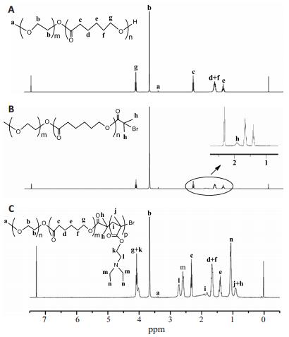 2 结果 2.1 聚合物结构表征结果分析 2.1.1 FT-IR谱图结果分析图 2中所有谱图均在1109 cm-1处存在有mPEG链段C-O键的伸缩振动峰,在1724 cm-1处存在有PCL链段C=O键的伸缩振动峰,在2878 cm-1处存在有mPEG链段和PCL链段-CH2-的伸缩振动峰,表明mPEG和ε-CL合成成功。由于在mPEG5k-PCL10k-Br中的-C-Br-所占比例很小,因此图 2A,B差别不明显。图 2C中在2776 cm-1和2834 cm-1处可以明显看到DEAEMA特有的甲基和亚甲基的伸缩峰,表明DEAEMA与mPEG5k-PCL10k-Br成功发生聚合,红外图谱结果与聚合物的预计结构一致。同理,mPEG5k-PCL13k-PDEAEMA10k按同样的方法进行红外分析,也确证得到了相应的三嵌段聚合物。