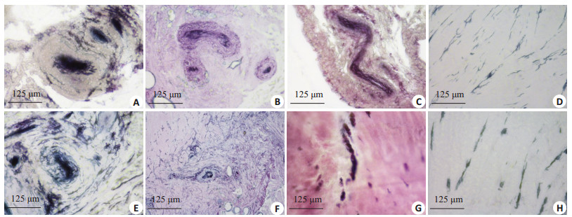 图 7 正常和异常变异的本体感受器对比 Figure 7 Comparison of normal and variable proprioceptors (Original magnification: × 400). A, B, C, D: Ruffini corpuscle, Pacinian corpuscle, Golgi tendon organs and free nerve endings in the normal ACL, respectively; E, F, G: Variable Ruffini corpuscle, Pacinian corpuscle and Golgi tendon organs in the injured ACL, respectively; H: Free nerve endings in the injured ACL, where the number of the nerve endings became less. |
