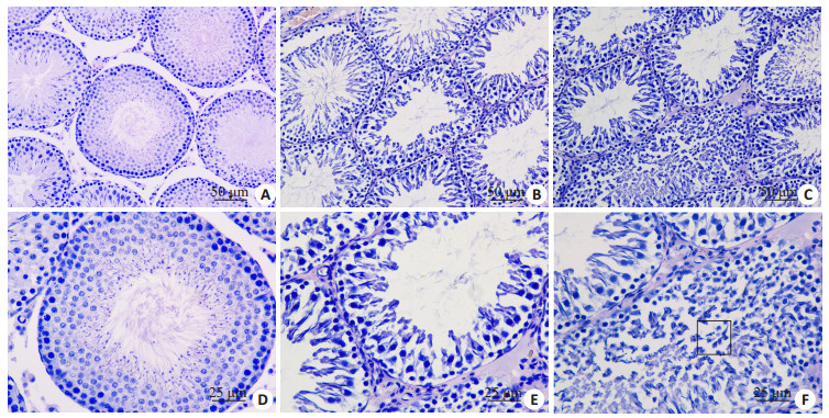 2 结果 2.1 睾丸组织形态学变化HE染色(图 1)发现DEHP暴露后,大鼠睾丸组织曲细精管中生精细胞数量明显减少,排列紊乱,官腔中央少见精子,且延长的精子细胞排列失去极性(如图 1F方框所示)。