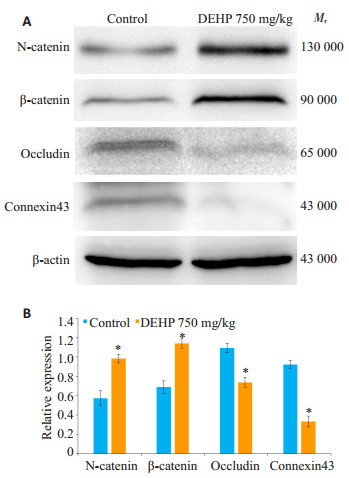 为了明确DEHP所导致的生精功能损伤归因于血睾屏障完整性被破坏,我们提取睾丸组织膜蛋白,通过Western blot检测了构成血睾屏障的4种主要连接蛋白的表达水平。如图 2所示,DEHP暴露后,粘附连接蛋白N-cadherin和β-catenin的表达明显增加,紧密连接蛋白occludin和缝隙连接蛋白connexin43的表达则显著减少(P < 0.05),表明DEHP暴露破坏了睾丸血睾屏障完整性。