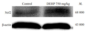 图 3 DEHP暴露后抗氧化应激蛋白的Nrf2表达水平 Figure 3 Expression level of anti-oxidative protein Nrf2 after DEHP exposure. |