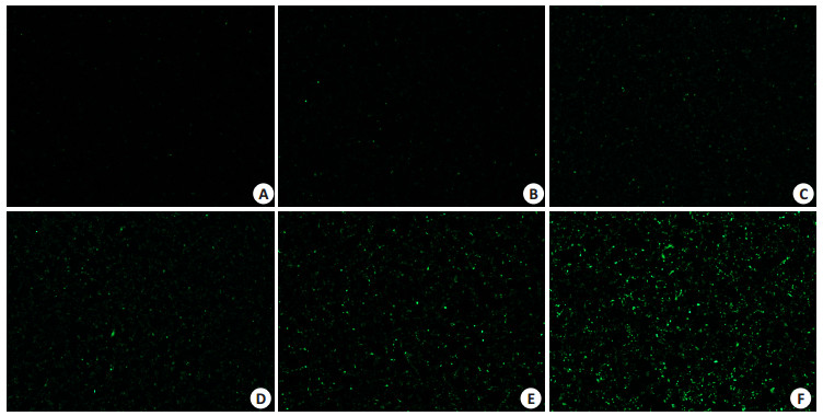 图 5 DEHP暴露后Sertoli细胞中ROS生产水平 Figure 5 ROS generation level in Sertoli cells after DEHP exposure (×40). A: blank control; B: DMSO control; C: 6.25 μmol/L DEHP; D: 12.5 μmol/L DEHP; E: 25 μmol/L DEHP; F: 50 μmol/L DEHP. |