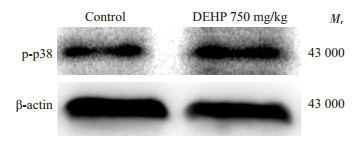 图 6 DEHP暴露后睾丸组织中p-p38表达水平 Figure 6 p-p38 expression in the testes of the rats after DEHP exposure. |