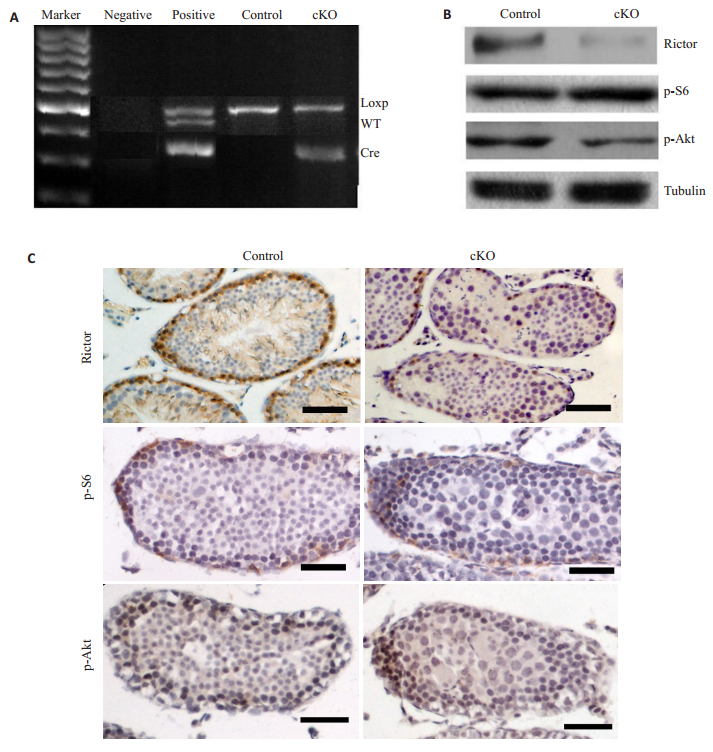 2 结果 2.1 rictor敲除鼠的敲除效果鉴定应用Cre-loxP原理,构建睾丸支持细胞特异性敲除rictor小鼠。仔鼠出生后约3周时,提取尾巴组织DNA,通过PCR反应扩增后进行琼脂糖凝胶电泳,根据PCR产物的条带数量和大小确定小鼠基因型(图 1A)。Western blot和IHC检测对照鼠和敲除鼠的Rictor、p-S6(Ser235/236)和p-Akt(Ser473)表达。结果显示,与对照鼠相比,敲除鼠Rictor表达量明显降低,p-S6(Ser235/ 236)没有显著差异,p-Akt(Ser473)表达下降(图 1B~C)。