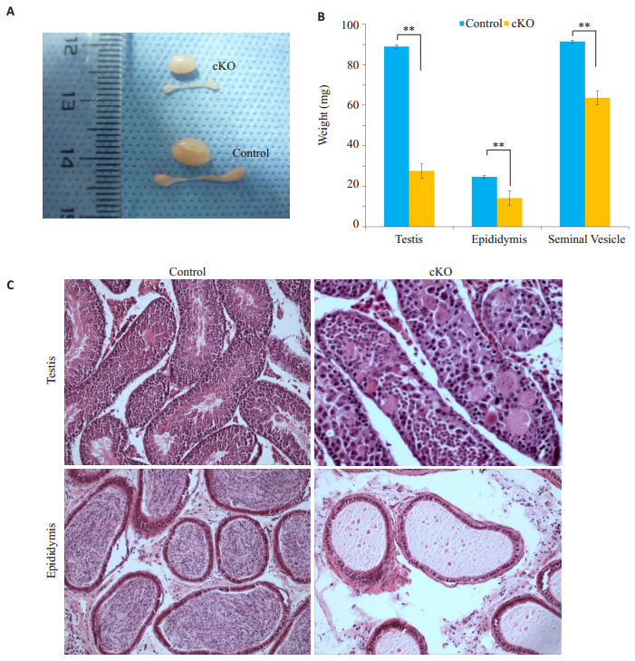 图 2 敲除鼠与对照鼠的表型变化 Figure 2 Changes of the control and rictor-knockout (cKO) mice. A: Gross observation of the testes and epididymis of the control and cKO mice; B: Comparison of body weight (BW) and the weights of testis, epididymis, and seminal vesicle (SV) between control and cKO mice (**P < 0.01); C: Histological changes in seminiferous tubules and epididymis in control and cKO mice (HE, ×20). |