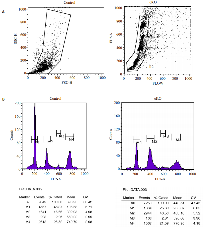 图 3 流式细胞技术检测对照鼠和敲除鼠生精小管中全部细胞DNA周期 Figure 3 Flow cytometry analysis of the subgroups in the germ cells of the control and cKO mice. A: Cell sub-groups of the germ cells after propidium iodide labeling based on flow cytometry; B: Flow cytometry analysis of DNA content in germ cells after propidium iodide labeling: M1: Haploid cells; M2: Diploid cells; M3: Triploid; M4: Tetraploid cells. |