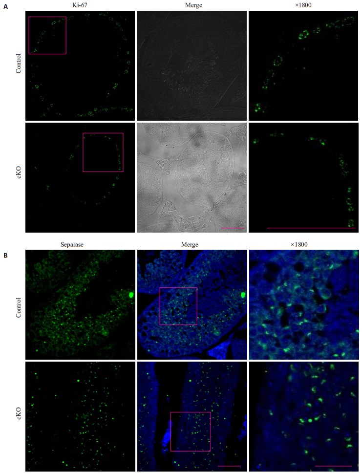 图 4 对照鼠与敲除鼠(A)Ki-67和(B)Separase的IF表达图 Figure 4 Immunofluorescence assay of Ki-67 (A) and separase (B) in the testes of control and cKO mice. The cell nuclei were stained blue by DAPI staining, and the target proteins were stained green. Scale bar=25 μm for the first two panels and 10 μm for the last panels. |