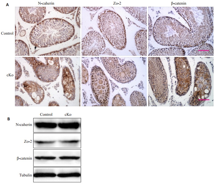 IHC法标记若干BTB相关蛋白表达,这些蛋白包括紧密连接相关标志蛋白(ZO-2);beta-连接素(β-catenin)和N-钙粘附蛋白(N-cadherin)。结果显示,在对照鼠生精小管中,3种蛋白均特异性分布在生精上皮基底膜处,均匀而规则。相比之下,敲除鼠生精小管的上述蛋白表达均分布在整个生精小管,杂乱无章,且有向中间管腔部位集中的趋势(图 5A)。此外,Western blot检测对照鼠和敲除鼠中生精小管上述蛋白的表达量,结果显示,3种蛋白的表达量均无显著差异(图 5B)。