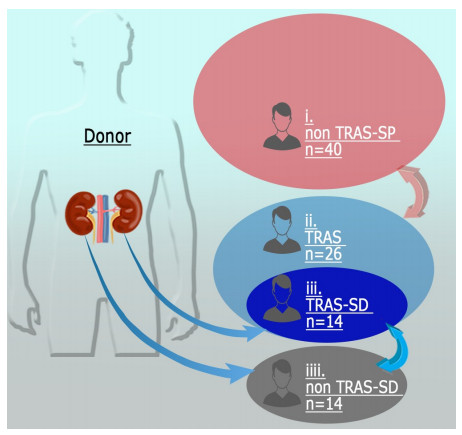 1 资料和方法 1.1 研究对象80例患者,其中26例为TRAS患者(TRAS组),和40例年龄相近(年龄差≤5)并于同期接受肾移植且非TRAS患者作为对照(非TRAS同期组),14例为与TRAS组患者供肾来自同一供者的且坚持随访的非TRAS受者,并与对应的26例TRAS患者中的14例形成巢式对照,分别为TRAS同供组和非TRAS同供组(图 1)。收集上述80例受者的人口统计资料、临床资料、随访资料。DGF定义为移植后1周内需要血液透析;CMV感染诊断标准为血清CMV-DNA定量>500 copies/mL。