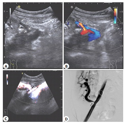 图 2 TRAS超声检查图像(箭头示狭窄部位) Figure 2 Ultrasound scan and digital subtraction angiography (DSA) for transplant renal artery stenosis (TRAS) (arrows show site of stenosis). A: Two-dimensional ultrasound image of TRAS; B: Color Doppler ultrasound image of TRAS; C: Power Doppler ultrasound image of TRAS; D: DSA of TRAS. |