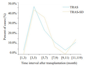 图 3 TRAS组和TRAS-SD组确诊时间分布 Figure 3 Time interval from transplantation to TRAS diagnosis in TRAS group and TRAS-SD group. |