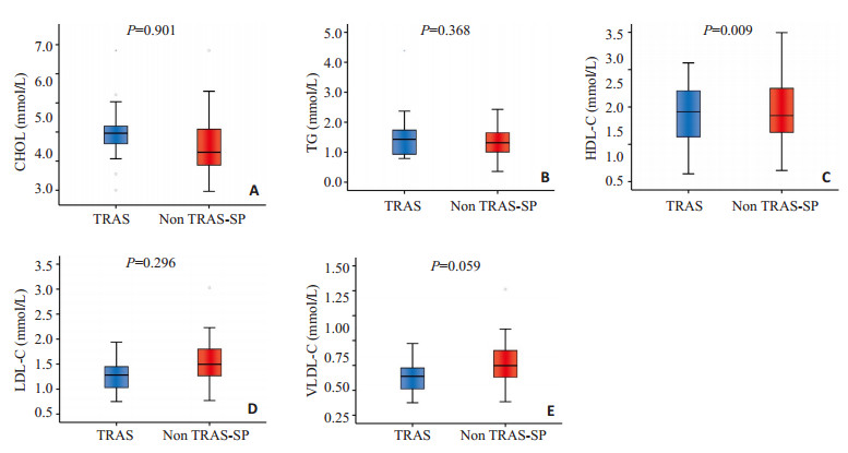 图 4 TRAS组和非TRAST同期组移植术后第5个月血酯水平 Figure 4 Serum lipids 5 months after transplantation in TRAS group and non-TRAS-SP group. A: Comparison of the levels of cholesterol (CHOL); B: Comparison of the levels of triglyceride (TG); C: Comparison of the levels of high-density lipoprotein cholesterol (HDL-C); D: Comparison of the levels of low-density lipoprotein cholesterol (LDL-C); E: Comparison of the levels of very low-density lipoprotein cholesterol (VLDL-C). |