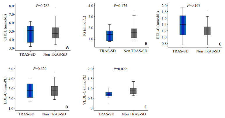 图 5 TRAS同供组和非TRAST同供组移植术后第5个月血酯水平 Figure 5 Serum lipids 5 months after transplantation in TRAS-SD group and non-TRAS-SD group. A: Comparison of the levels of cholesterol (CHOL); B: Comparison of the levels of triglyceride (TG); C: Comparison of the levels of high-density lipoprotein cholesterol (HDL-C); D: Comparison of the levels of low-density lipoprotein cholesterol (LDL-C); E: Comparison of the levels of very low-density lipoprotein cholesterol (VLDL-C). |