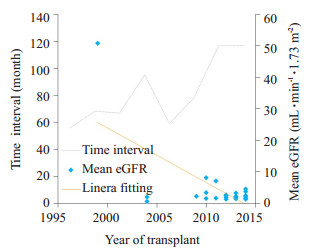 绘制26例TRAS患者移植-TRAS确诊时间的散点图和对应的线性趋势以及确诊TRAS时平均eGFR水平折线图。随着年份增加,肾移植-TRAS确诊时间缩短,而确诊时平均eGFR呈升高趋势(图 6)。