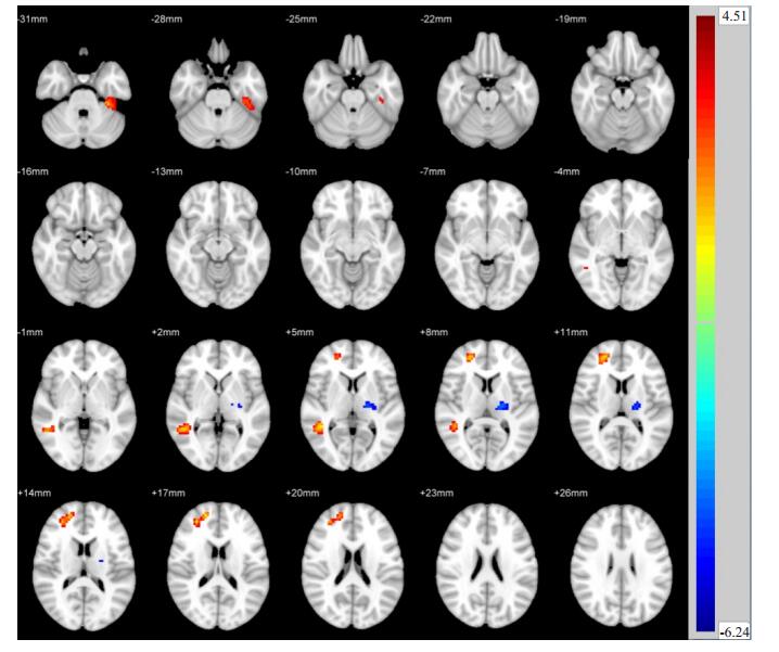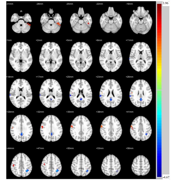 图 1 Painful DPN组与Non-DPN组比较ReHo差异区域 Fig.1 Regional differences in ReHo between painful DPN group and non-DPN group. |