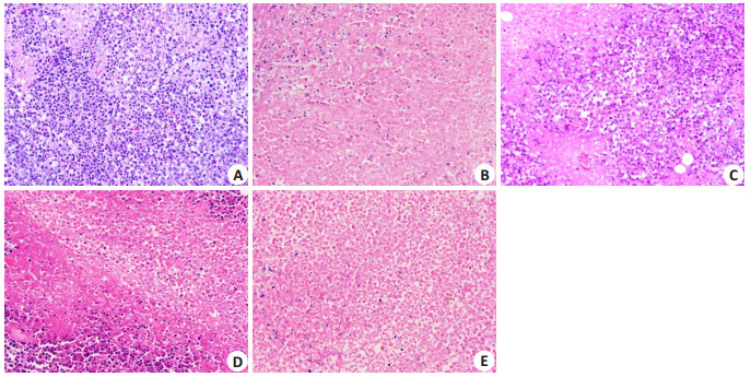 图 1 荷瘤小鼠肿瘤组织HE染色切片 Fig.1 HE staining of the tumor tissue in the tumor-bearing mice in different groups (HE staining, ×200). A: Model group; B: CTX group; C: JW-L group; D: JW-M group; E: JW-H group. |