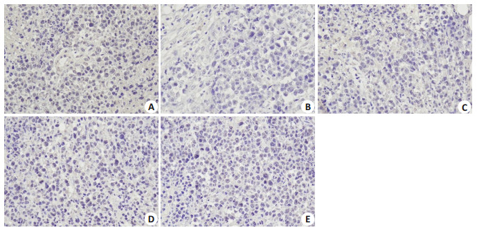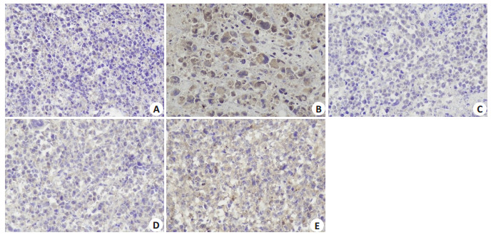 图 3 肿瘤组织免疫组化Bcl-2表达 Fig.3 Immunohistochemical detection of Bcl-2 expression in the tumor tissues in different groups (DAB staining, ×400). A: Model group; B: CTX group; C: JW-L group; D: JW-M group; E: JW-H group. |