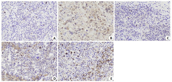 图 4 肿瘤组织免疫组化caspase-3表达 Fig.4 Immunohistochemical detection of caspase- 3 expression in the tumor tissues in different groups (DAB staining, ×400). A: Model group; B: CTX group; C: JW-L group; D: JW-M group; E: JW-H group. |