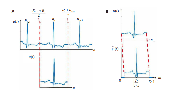 图 2 心拍分割(A)与心拍校正示例(B) Fig.2 Illustration of heartbeat segmentation (A) and heartbeat alignment (B). |