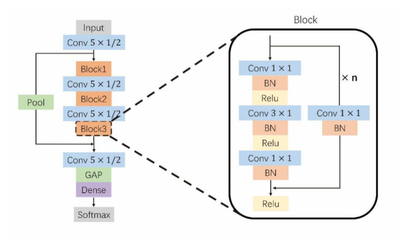 利用深度残差网络[15]的优点,在网络中间层使用跳跃式传递,一方面有利于梯度向下传播,另一方面,残差块中瓶颈[15]的存在可以使得网络参数极大减少。第二层卷积层与Block3之间的密集连接[16]可以使得网络在进行若干次卷积操作后依然可以直接利用到更原始的信息,同时有利于让梯度更好地向上传递。在主路径上,每个Block之间使用步长为2的卷积操作替代传统的池化层,同时起到特征提取和池化的作用,简化了网络结构。每一个卷积操作后都进行了批处理化[17],防止梯度弥散,使每一层输出的特征映射都映射到同一分布上,加快训练速度。在激活函数的选择上,使用卷积神经网络中最常用的非线性激活函数ReLu。然后用Network In Network [18]中提出的全局平均池化层替换传统卷积神经网络的全连接层。全局平均池化层对最后一层卷积的每一个特征映射求取均值,池化操作不需要进行参数更新,因此可以减少全连接层带来的参数数量,缩短网络训练时间,增强神经网络的表示能力,另一方面,又可以起到正则化的作用,防止过拟合[19]。最后将池化后的值经过Dense层连接成向量送进softmax得到各分类的概率值。