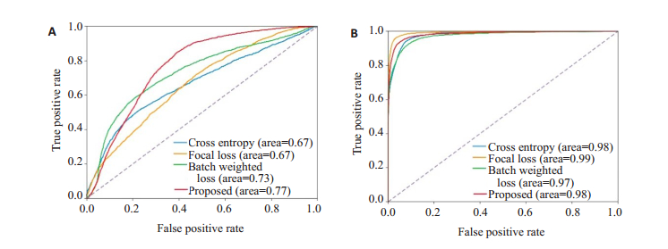 图 4 不同损失函数下的ROC曲线 Fig.4 ROC curves under different loss functions. A: ROC and AUC for SVEB; B: ROC and AUC for VEB. The AUC of the proposed loss function reached 0.77 and 0.98 for SVEB and VEB, respectively. |