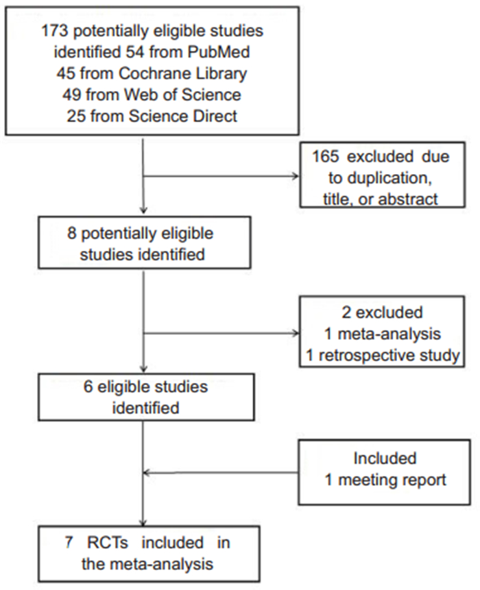 RESULTS Study selection and characteristicsBased on our search strategy, we identified a total of 173 potentially eligible RCTs from the databases (Fig. 1), among them 7 studies[6-12]involving a total of 729 patients met the inclusion criteria for the meta-analysis. The authors of these 7 studies were from the United States[7], Italy[6], Spain[8], Oman[9], Turkey[10], Ireland[11]or Egypt[12]. The settings of these studies were mostly operating room and surgical intensive care unit, and in a small part were the emergency department or kidney dialysis center. All the subjects receiving the puncture were adult patients (Tab. 1).