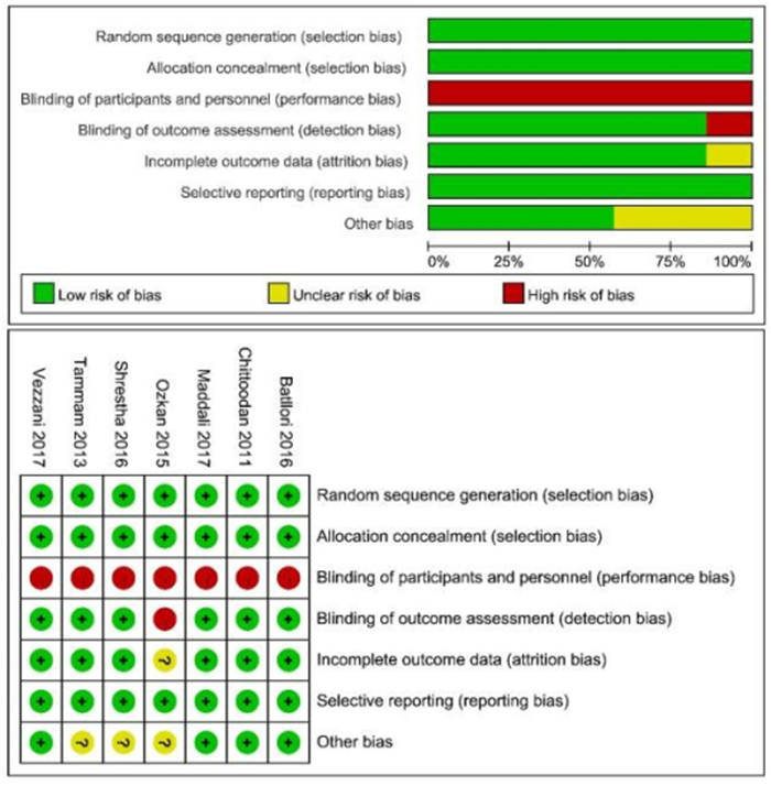 Cochrane tool was used to evaluate the risk of bias of the studies. All these studies were conducted with adequate randomization of sequence generation and allocation concealment. The participants and personnel in all these 7 studies were not blinded (Fig. 2). According to the GRADE Working Group criteria, the grades of evidence for the first-attempt success rate and overall success rate were moderate, and those of other outcome measures were low.