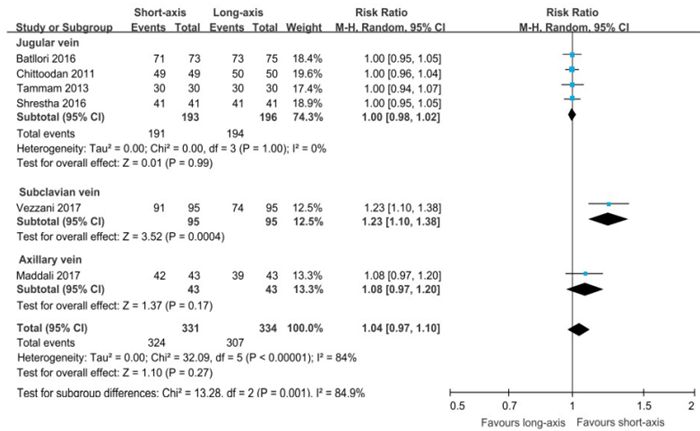 Overall puncture success rate Six RCTs [6, 9, 11, 12] reported the overall puncture success rate. Pooled analysis showed no significant difference in the overall puncture success rate between SAX and LAX approach (RR=1.04; 95% CI: 0.97-1.10; P=0.27; I2=84%) (Fig. 4). Subgroup analysis, however, showed that the overall puncture success rate was significantly higher with the SAX than with the LAX approach in the SCV (RR=1.23, 95% CI: 1.10-1.38; P=0.0004).